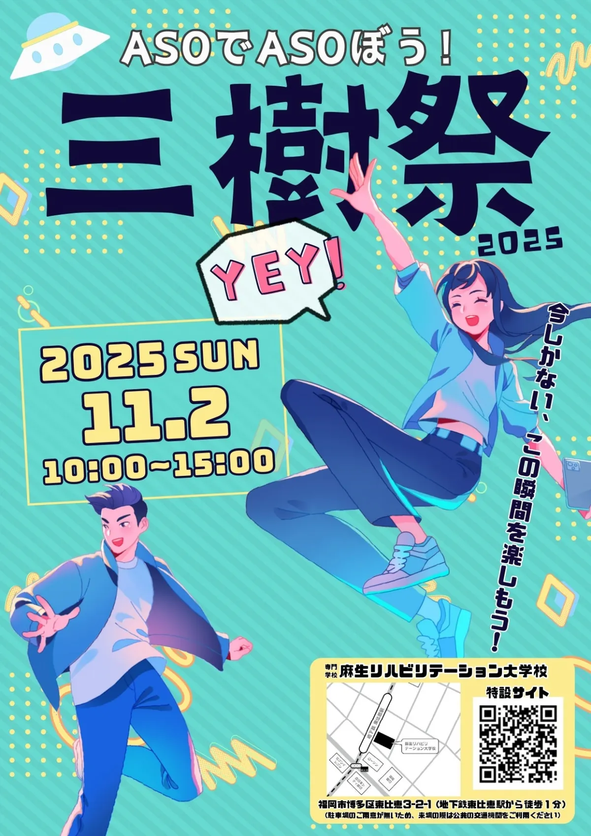 福岡麻生リハビリテーション大学校で毎年行われる学園祭「三樹祭」が、11月2日(日)に開催されます!今年のテーマは「ASOでASOぼう!ー麻生の最高到達点ー」。「三樹祭」では、学生たちの熱気あふれるパフォーマンスや様々な企画が用意されており、来場者全員が楽しめる内容となっています。