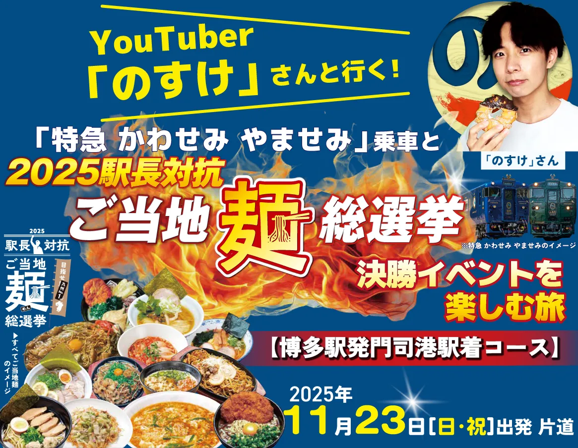 2025年11月23日、特別な旅が福岡で実現します。JR九州が主催する「YouTuberのすけさんと行く!特急 かわせみやませみ乗車と2025駅長対抗『ご当地麺総選挙』決勝イベントを楽しむ旅」が開催されます。注目のYouTuber、のすけさんが特別ゲストとして参加し、ファンとの交流も盛りだくさんの内容となっています。