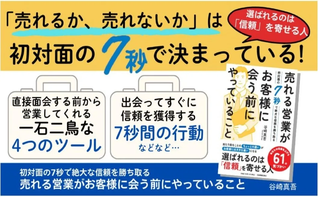 2025年4月25日、株式会社ウィルステップの谷崎真吾氏が著した書籍『売れる営業がお客様に会う前にやっていること 初対面の7秒で絶大な信頼を勝ち取る』が発売されます。この本では、営業の真髄に迫り、顧客との出会いにおける信頼の重要性を余すところなく紹介しています。