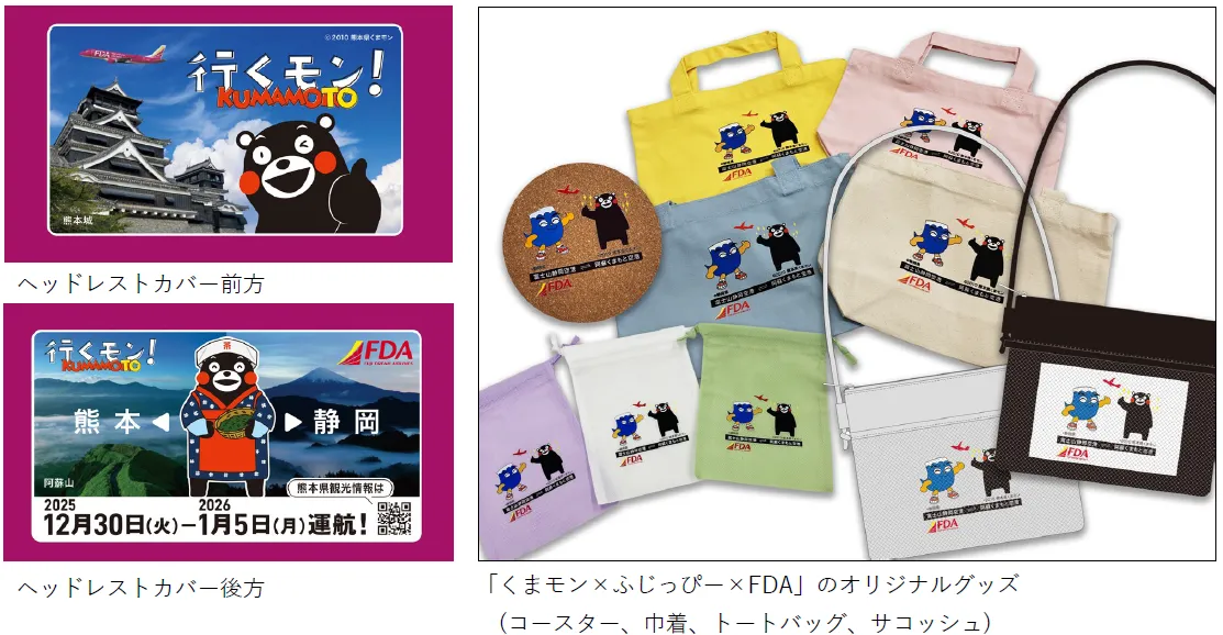 さらに、特定の便に搭乗するお客様には、「くまモン×ふじっぴー×FDA」のオリジナルグッズがプレゼントされます。このグッズは、熊本と静岡間をつなぐ「熊本=静岡」線の便をご利用いただく際に受け取ることができる特典です。