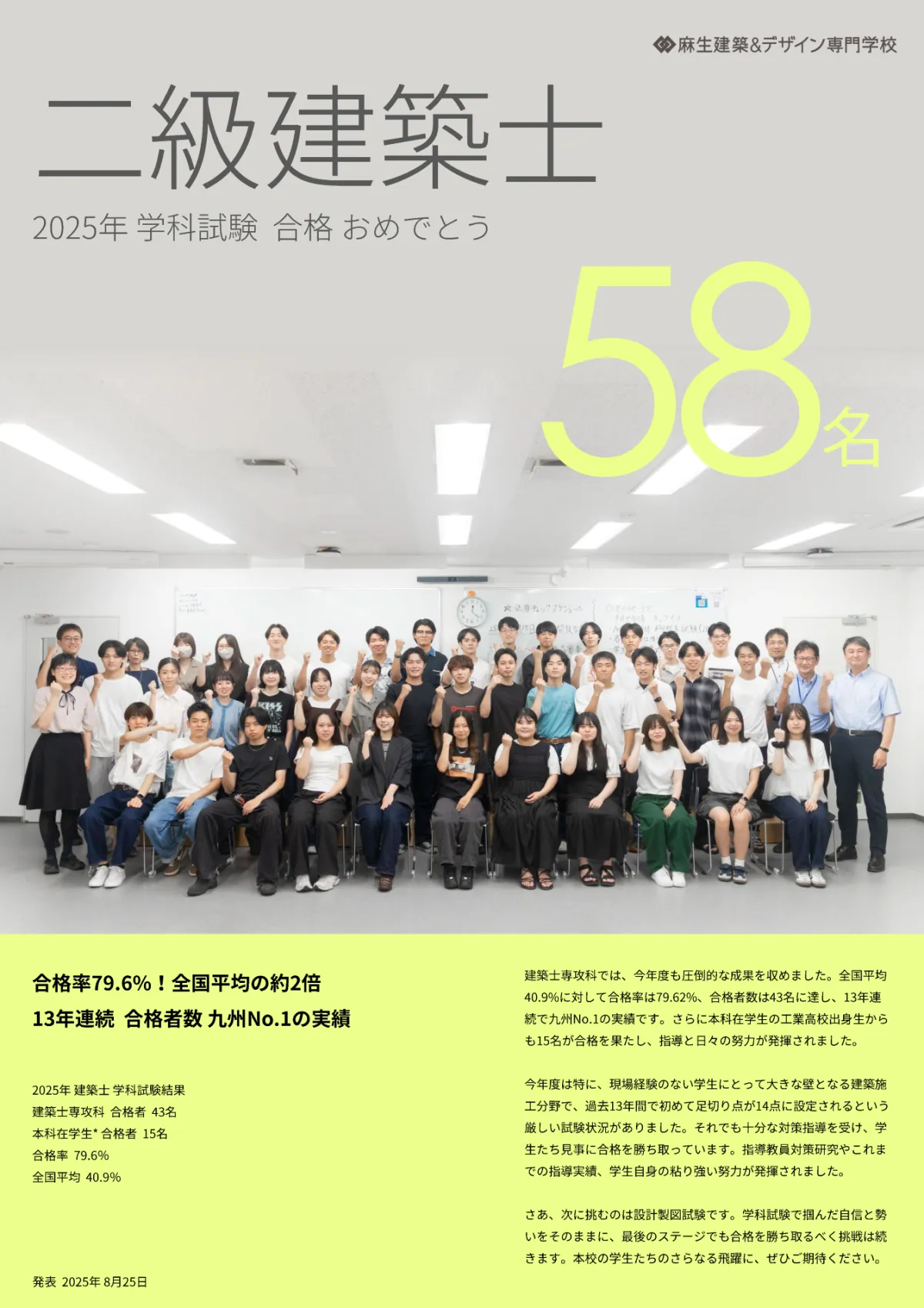 8月25日、令和7年度二級建築士学科試験の結果が発表され、福岡麻生建築&デザイン専門学校が13年連続で九州No.1を達成しました。これは建築分野における学生たちの努力と、教師陣の手厚いサポートの賜物です。