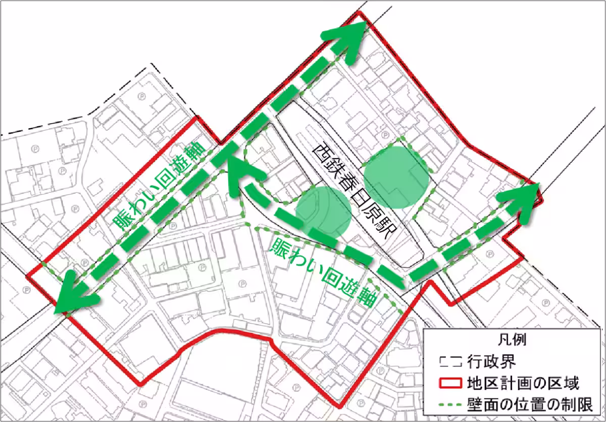 プロジェクトの対象区域は、西鉄春日原駅周辺の特定の地区です。具体的には、壁面後退や滞留空間の整備に関して、以下のような条件が設定されています。
