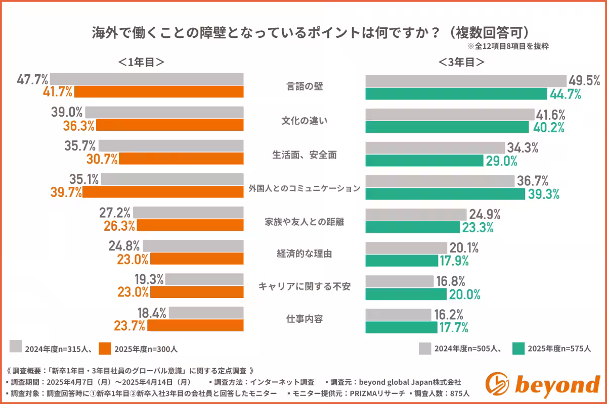 ただし、若手社員が海外勤務を希望する一方で、課題も多く存在します。調査では、海外での勤務にあたって「言語の壁」や「文化の違い」が以前よりは少し減少したものの、まだ心理的なハードルが存在することが示されました。さらに「外国人とのコミュニケーション」への不安が残り、これに対するサポートの重要性が浮かび上がりました。
