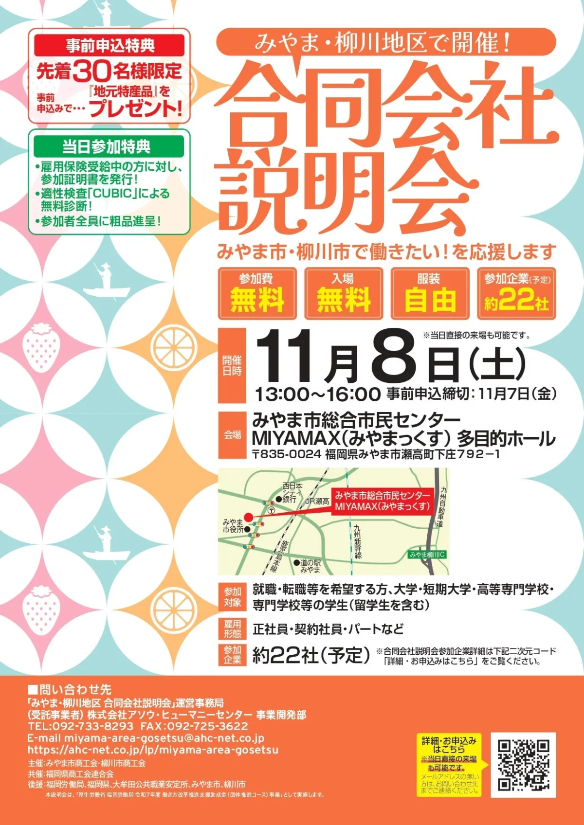 合同会社説明会の開催が決定しました。これは、小規模事業者の人材確保と地域の雇用創出を目指すイベントです。11月8日(土)13:00から、みやま市総合市民センター「MIYAMAX」にて行われます。就職や転職を希望する方や学生の皆さんにとって、素晴らしいチャンスとなることでしょう。