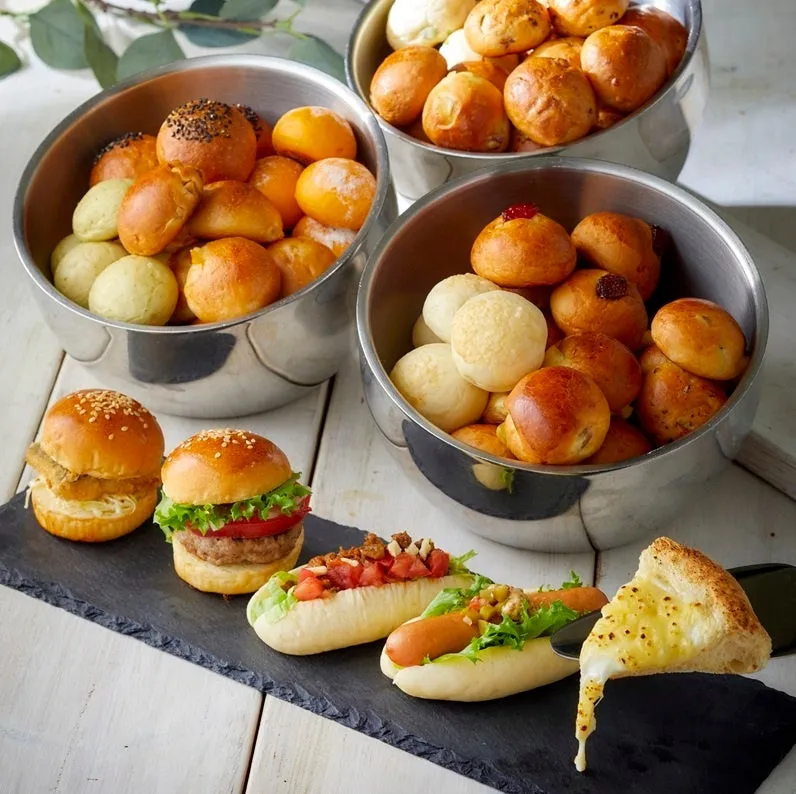 ブーランジェショーでは、自慢のパンを使った特製ハンバーガーや、長崎県産のあじのフライバーガー、メキシカンタコス風のホワイトドッグなど、目にも楽しい多彩なメニューが並びます。また、プティパンバーでは、ふわっとした食感が楽しめる超ミニサイズのプティパンが12種類あり、ひと口サイズで多様な味を楽しむことができます。