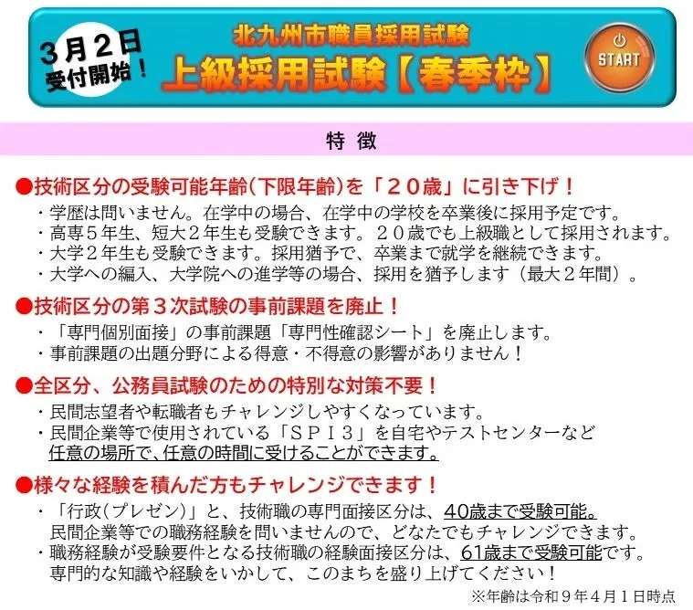 北九州市では、春季枠の職員募集を開始しました。この機会に、公務員の道にチャレンジしてみませんか?今回の募集は、一般事務員と一般技術員の職種があり、特に注目すべきは、受験方法が新しい形態で実施される点です。