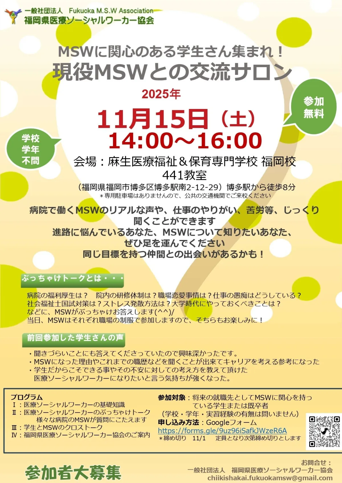 2025年11月15日(土)、福岡市博多区の麻生医療福祉&保育専門学校において、福岡県医療ソーシャルワーカー協会が主催する「MSW交流サロン」が開催されます。医療ソーシャルワーカー(MSW)に興味を持っている学生や既卒者の参加をお待ちしています。