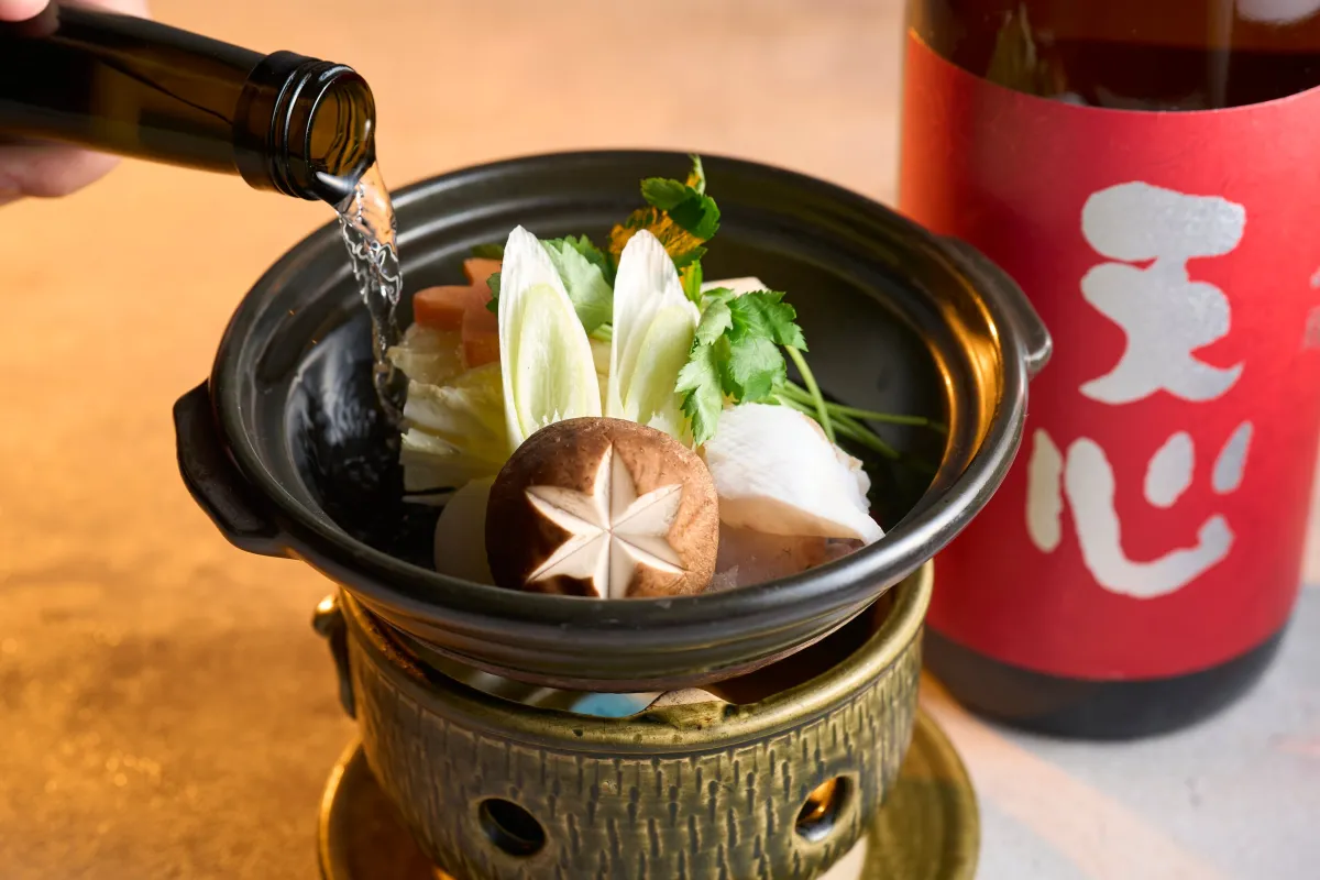使用される日本酒は、1844年創業の溝上酒造からの「天心 純米吟醸」。北九州産の山田錦と清らかな水を使用し、フルーティーでありながらも深みのある味わいが楽しめます。これに、季節の野菜や新鮮な具材を加えることで、鍋全体の味わいが充実していきます。クエの上品な脂と合わせて、旨味が染み渡った出汁は、食材の魅力を引き立てます。