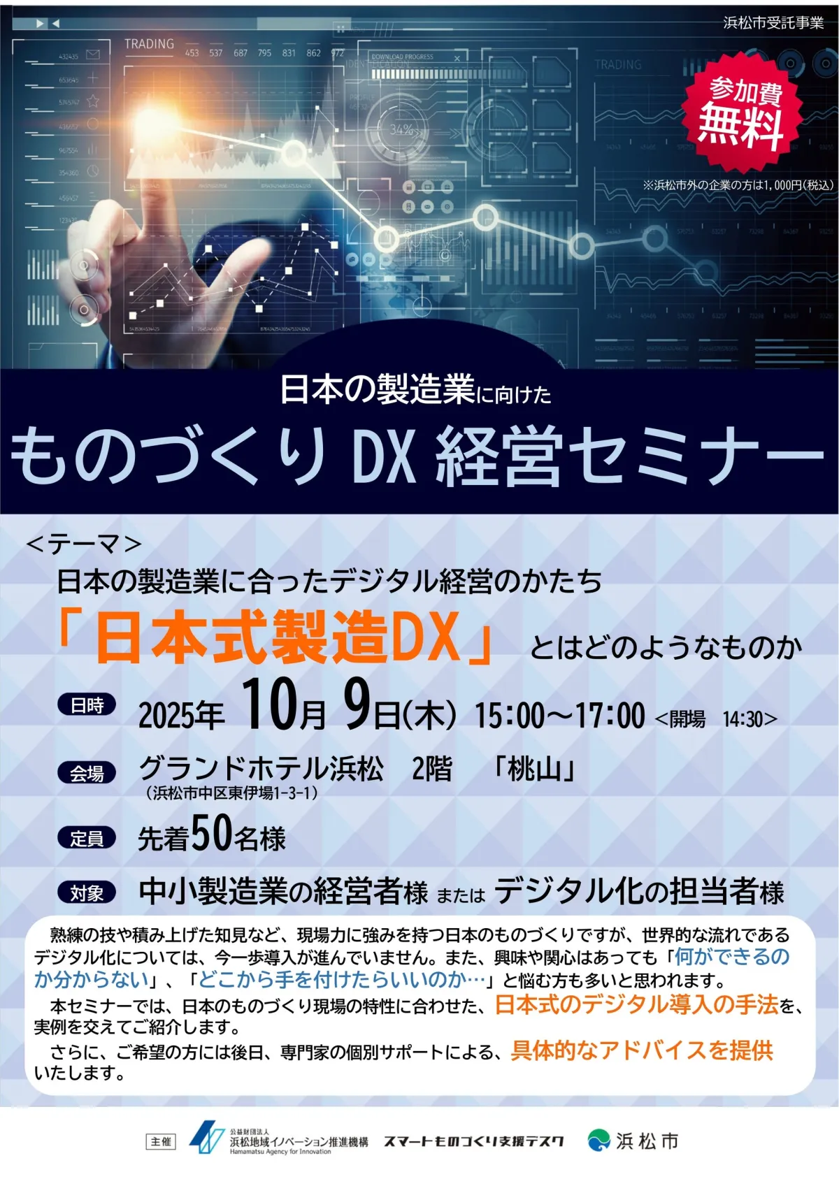 10月9日(木)、株式会社スカイディスクが主催する「日本の製造業に向けた『ものづくりDX経営セミナー』」に登壇します。このセミナーは、(公財)浜松地域イノベーション推進機構によって主催され、日本の製造業のデジタル変革についての貴重な情報が提供される場です。
