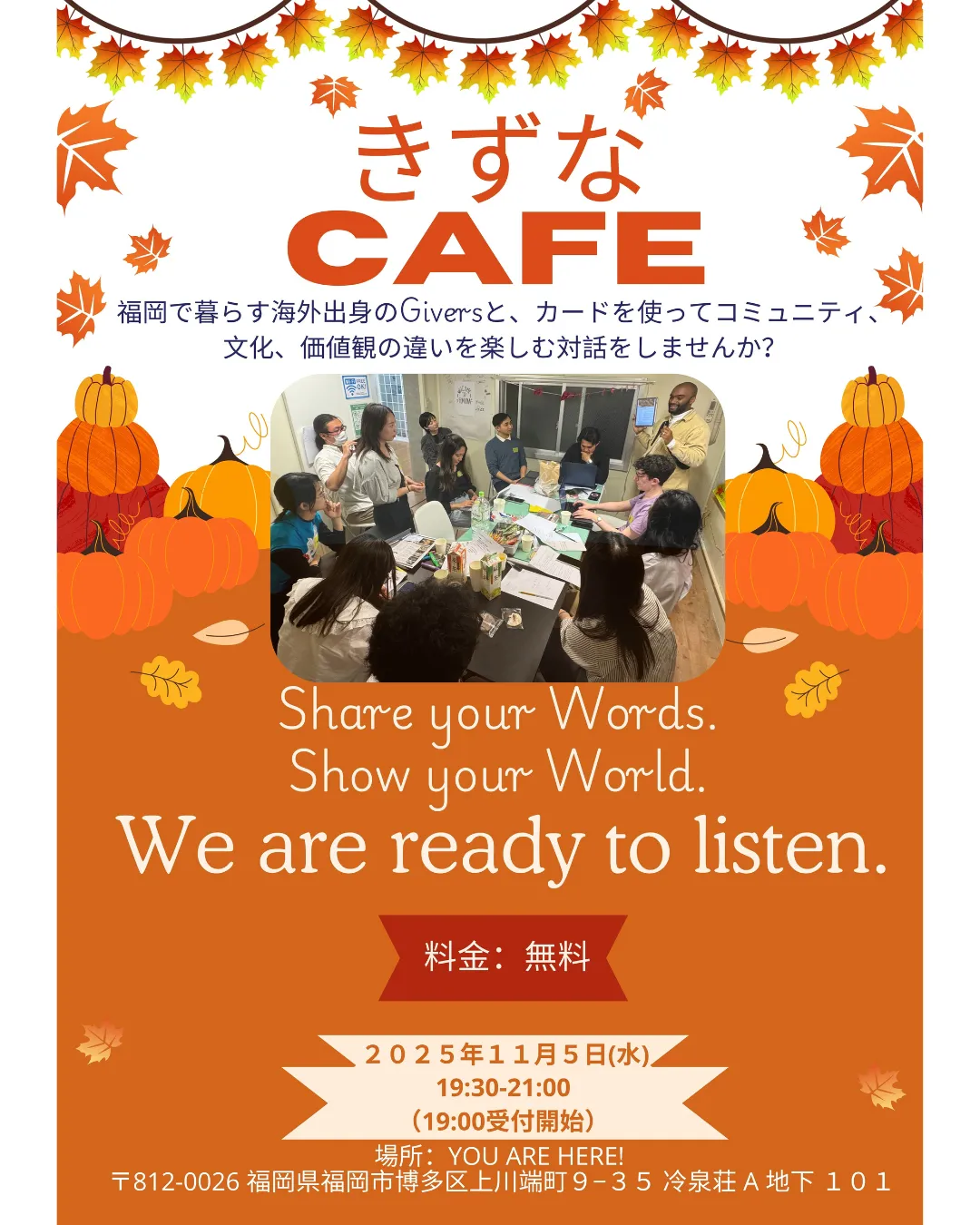 このイベントは、2025年11月5日(水)に福岡市博多区の冷泉荘地下101「ユウアヒア」で行われます。開場は19:00、イベントは19:30から開始されます。受付は先着20名のみのため、参加希望の方は早めの申し込みをおすすめします。