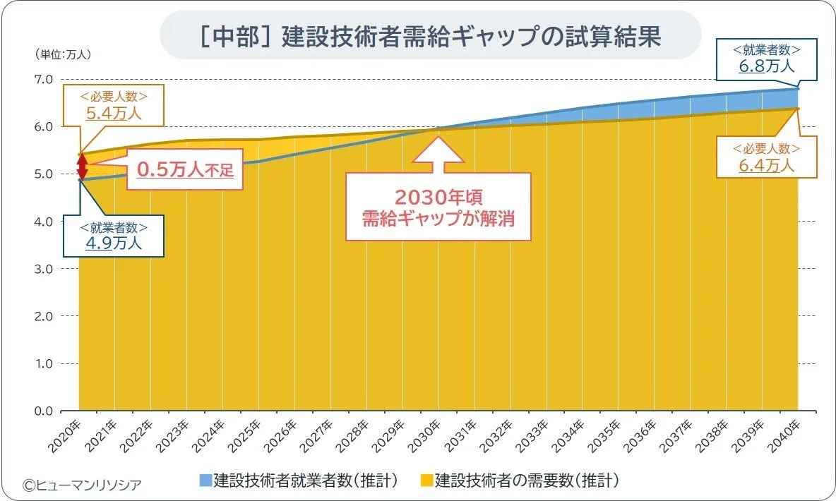 ヒューマンリソシアは、中部エリア、具体的には岐阜、静岡、愛知、三重の4県に焦点を当て、建設技術者および技能工の需給ギャップを試算しました。この調査は、全国版の建設技術者・技能工に関する将来推計をベースに行われており、中部特有のデータも反映されています。