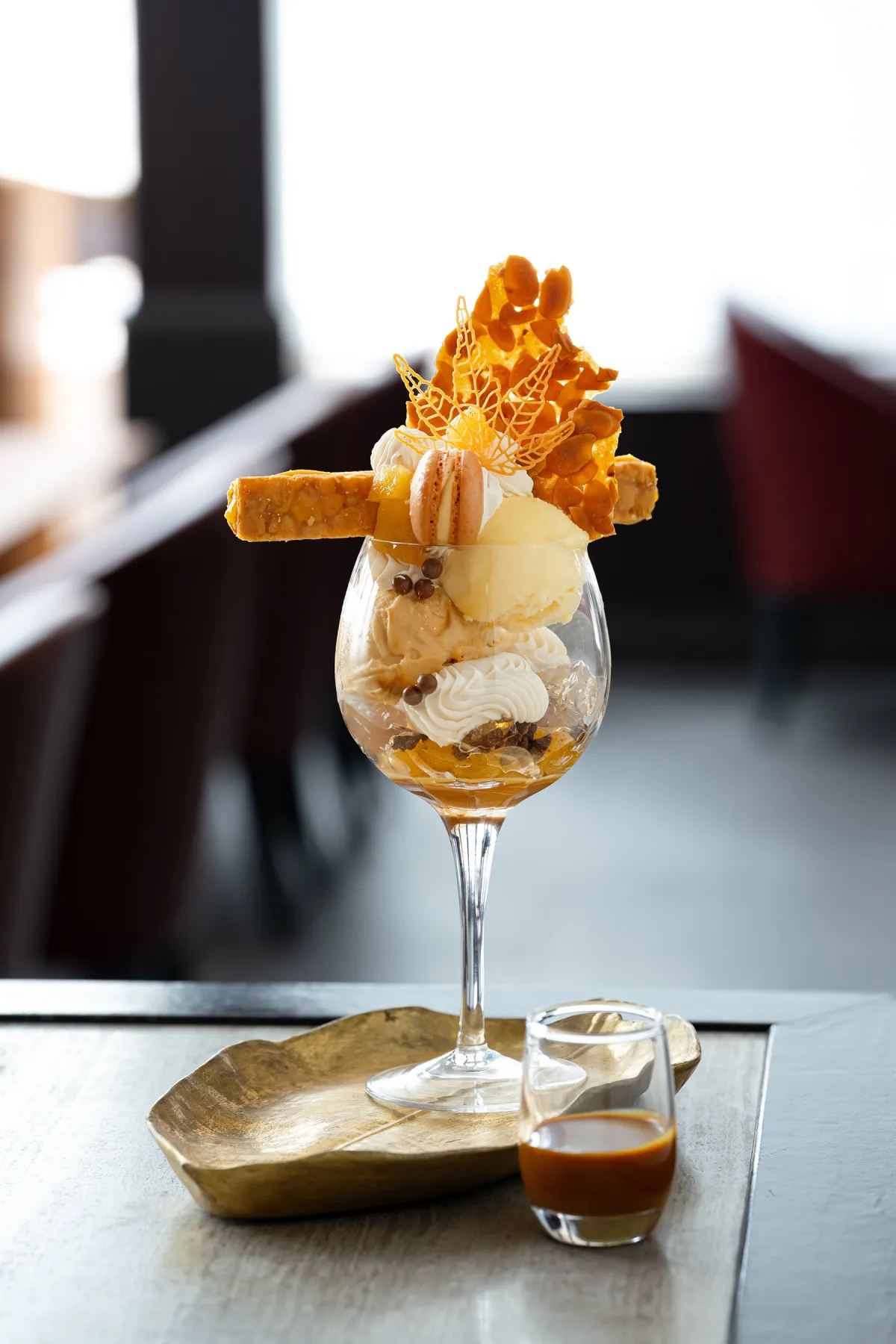 このパフェのトップには、香ばしさが際立つナッツ入りのフロランタンヌガーや、紅葉型のパニエが飾られています。その他にも、軽やかな食感のミルフィールキャラメルオランジェが添えられ、視覚的にも楽しませてくれます。グラスの中には、洋梨のキャラメルコンポート、キャラメルと洋梨を使ったジェラート、さらにはクレメンティンのジェラートやメープルクリーム、ショコラのジェノワーズなど、様々な味わいと食感が層を成し、ひと口ごとに異なる印象を与えます。10種類以上の素材が使われており、まさに贅沢なパフェです。