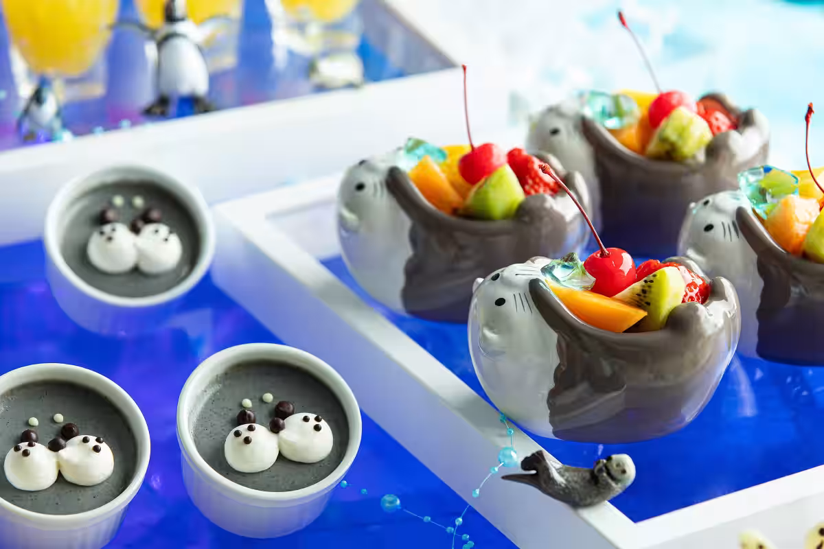 今回のデザートビュッフェでは、九州の海をテーマに、色鮮やかで見た目も楽しめるスイーツが約30種用意されています。特徴的なメニューには、チンアナゴが顔を覗かせた「ひょっこりチンアナゴのメロンショート」や、かわいいゴマフアザラシをモチーフにした「サクラちゃんのホワイトチョコレートムース」があり、まるで水族館にいるかのような楽しさです。