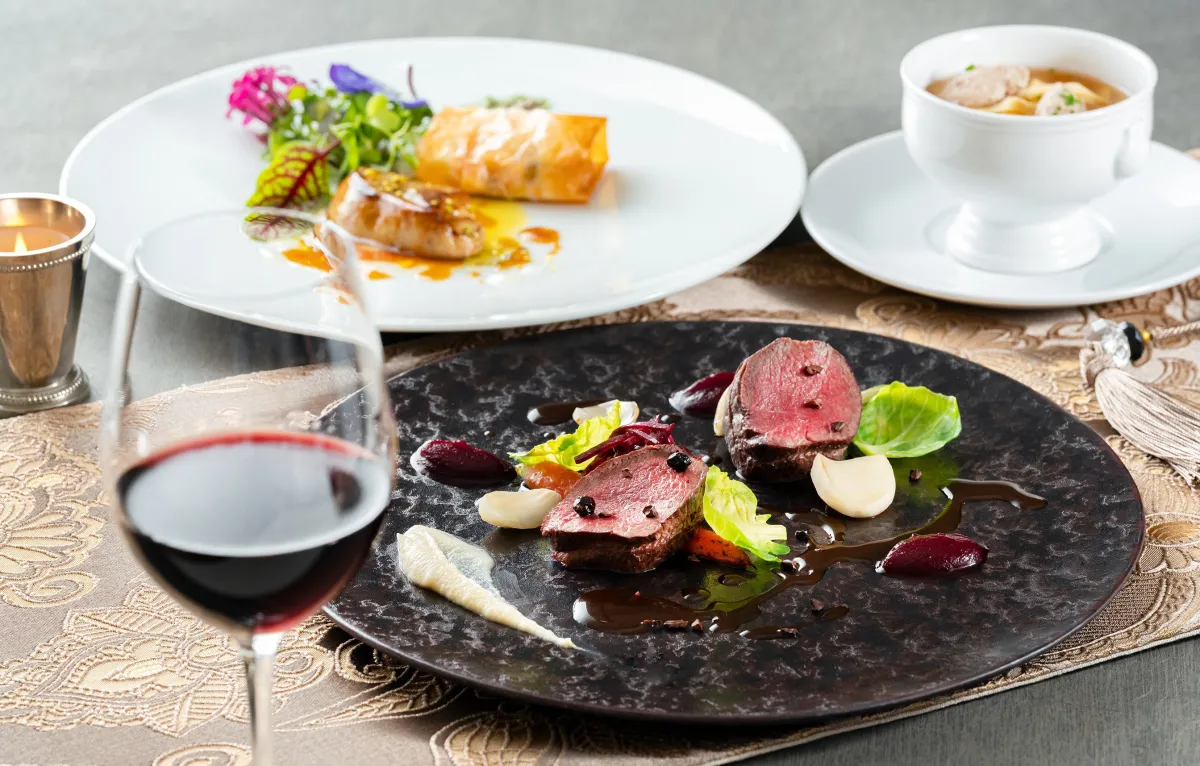 全7品からなるこのフルコースでは、フランスをはじめとした中欧各国の料理が一堂に会します。例えば、第一のコースにはハンガリー産のフォアグラを使用した前菜があり、林檎とレーズンのシュトゥーデルと共に供されます。続いてのメイン料理は、 鹿ロースのロティで、ブラウフレンキッシュの香りをまとわせた至極の一品です。最後にデザートにはウィーン発の名物、ザッハトルテが用意されています。