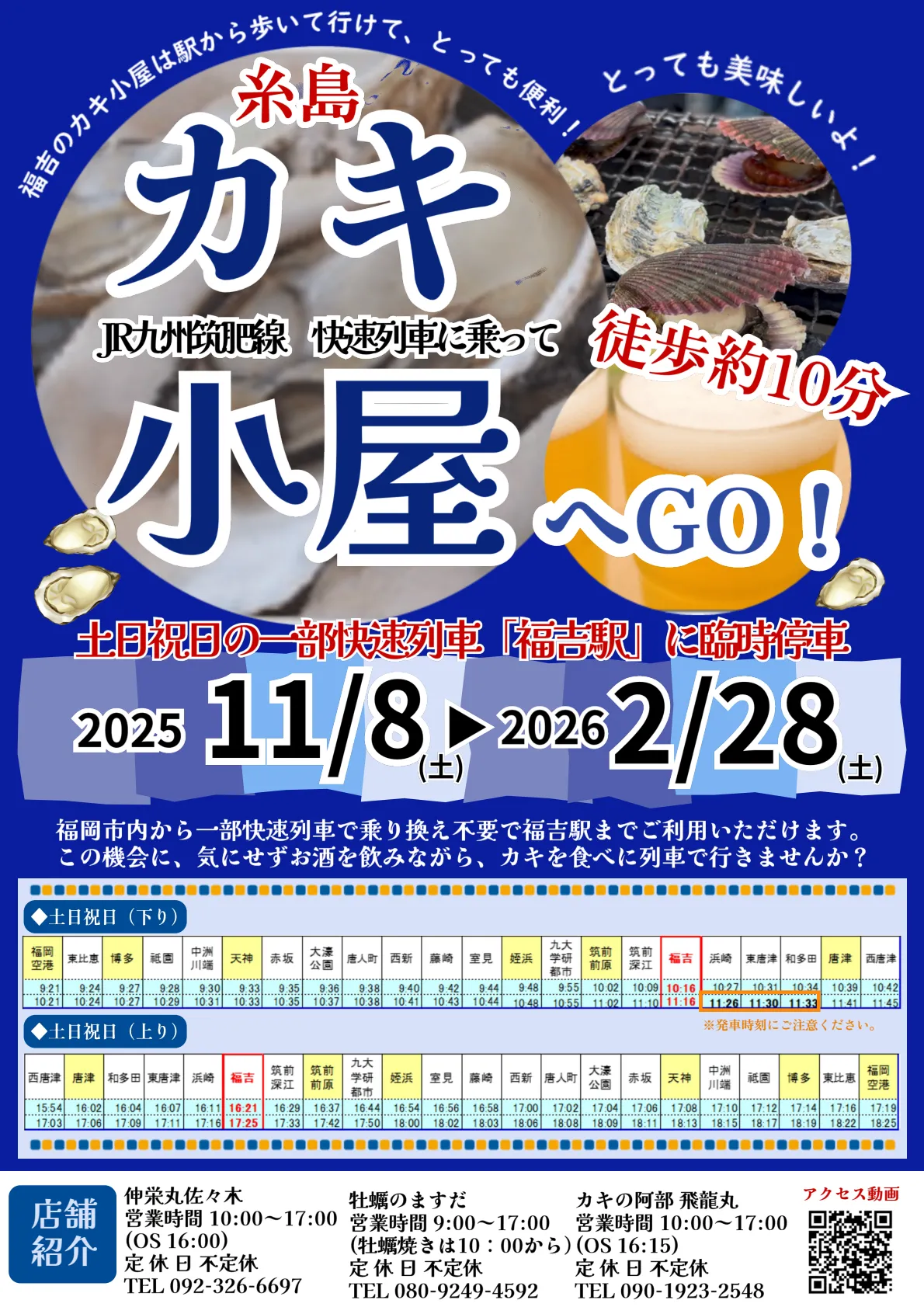 福岡県糸島市の福吉駅は、人気のカキシーズンを迎え、特別なサービスが始まります。2025年11月8日から2026年2月28日までの間、土曜日、日曜日、祝日には一部の快速列車が福吉駅に臨時停車します。これにより、福吉漁港の自慢のカキ小屋へも簡単にアクセスできるようになります。