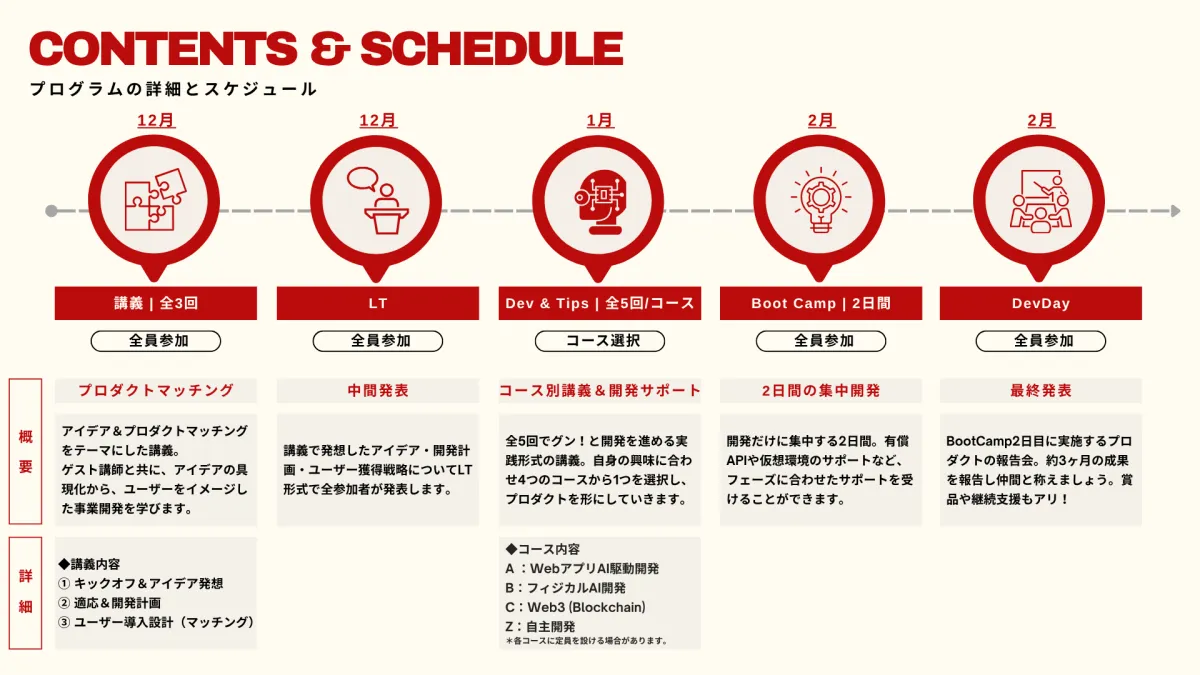 その後の「Dev & Tips」では、全5回の実践形式で、参加者は興味に応じて選択したコースに取り組むことができます。コースは多岐にわたり、WEBアプリやAI駆動開発、フィジカルAI開発、Blockchainアプリの開発に関するものがあります。また、独自のプロダクトを持っている方は、コミュニティマネージャーからフィードバックを受けるリソースも用意されています。最終的には、2日間集中して開発を行う「BootCamp」が設けられており、さらにすべてのプログラムは英語で受講可能です。