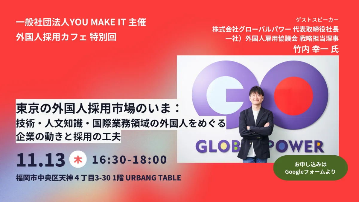 2025年11月13日(木)、福岡市天神にて、外国人採用を考える企業向けのセミナーが開催されます。このセミナーは、日本国内で外国人労働者を受け入れる企業に向けて、現在の採用動向や実例を詳しくお話しする貴重な機会です。