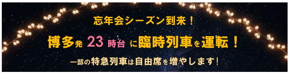 12月が近づくと共に、日本各地で忘年会シーズンが盛り上がりを見せます。福岡も例外ではなく、毎年多くの人々が集まり、仲間と楽しいひと時を過ごします。今年の忘年会は、JR九州の臨時列車と自由席の増加で、スムーズに帰ることができるチャンスです!