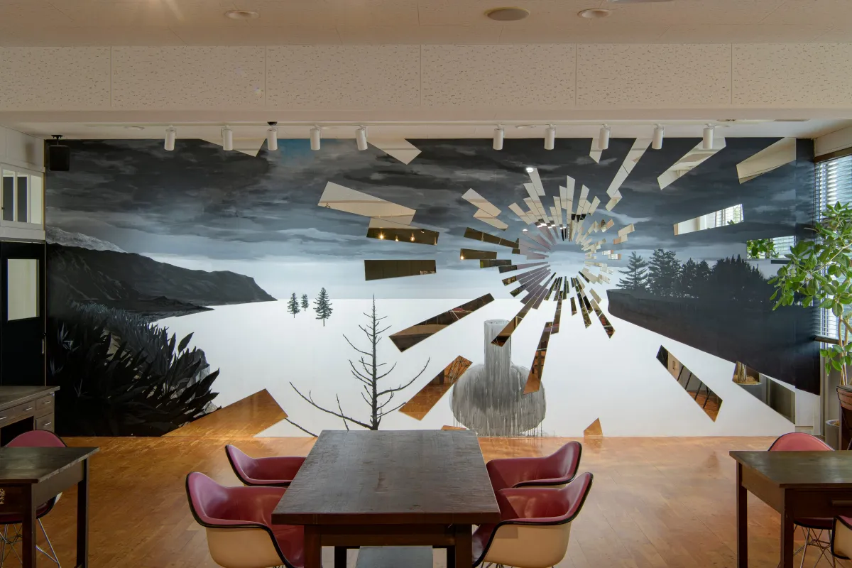 本作品は、Artist Cafe Fukuokaのコミュニティスペースに常設され、誰でも自由に鑑賞できるようになっています。栗林氏の作品は、放射線状に配置された鏡で構成されており、観覧者自身の姿や周囲の風景を映し出します。これにより、作品は鑑賞者と共に一つの体験を創出し、人々を作品の一部として巻き込みます。
