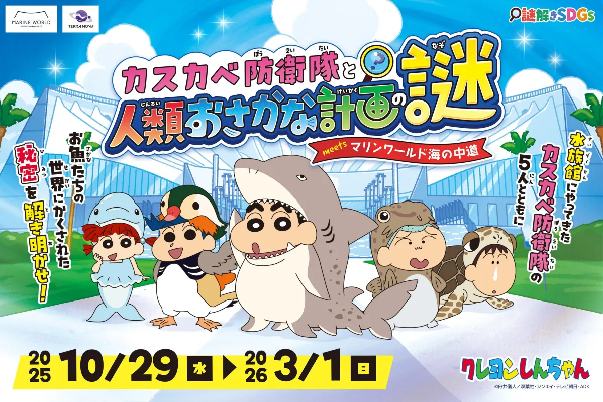 福岡の水族館『マリンワールド海の中道』にて、人気アニメ『クレヨンしんちゃん』のキャラクターたちが繰り広げるリアル謎解きイベントがついにスタートします!このイベントは2025年10月29日から2026年3月1日までの期間にわたり開催され、九州地方で初の試みとなる本格的な謎解き体験です。